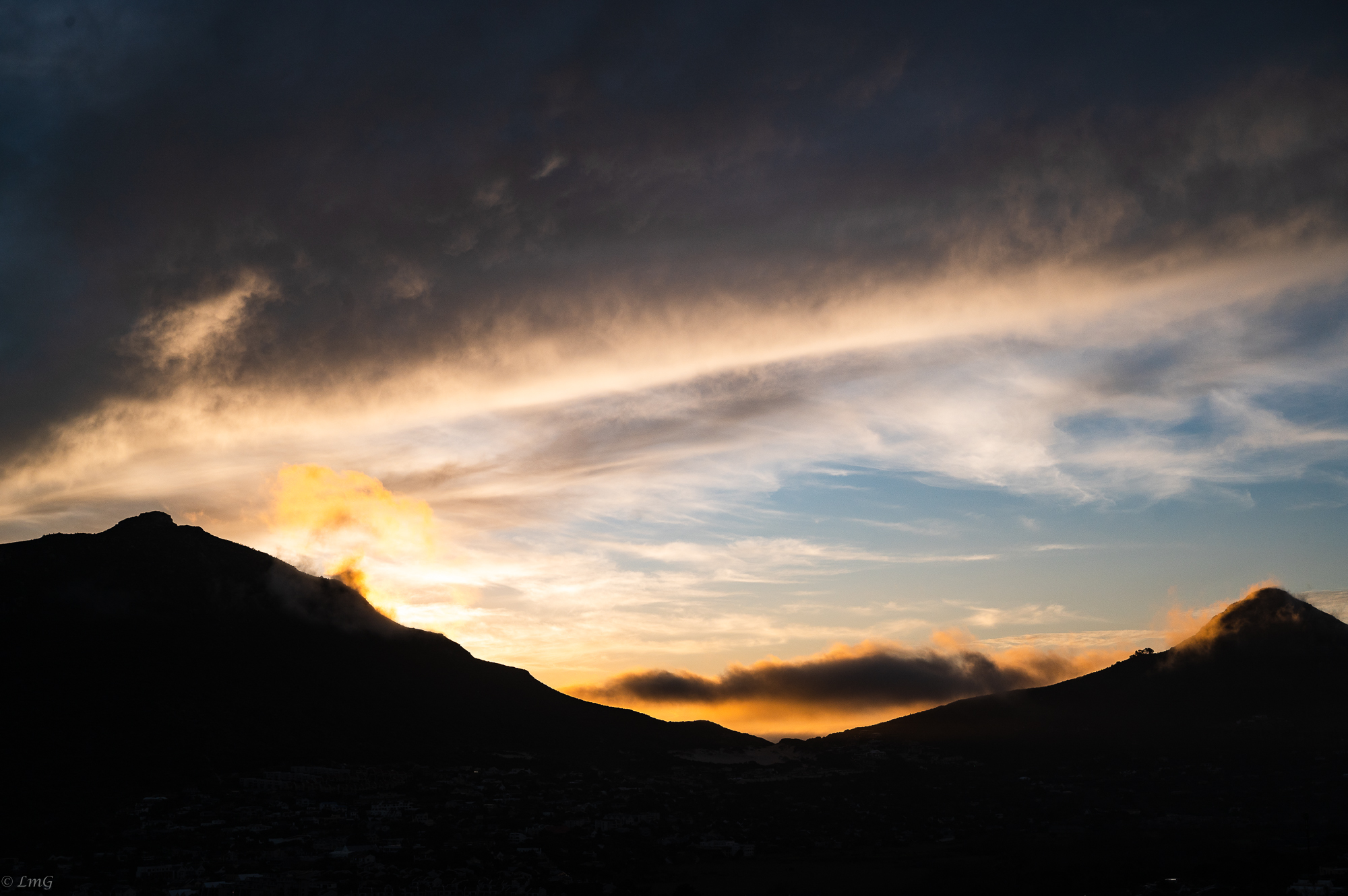 Sunset at the end of a very overcast day. Puffs of mist were lit up rather like a fire or mini volcano spouting from the rim of the mountain.-